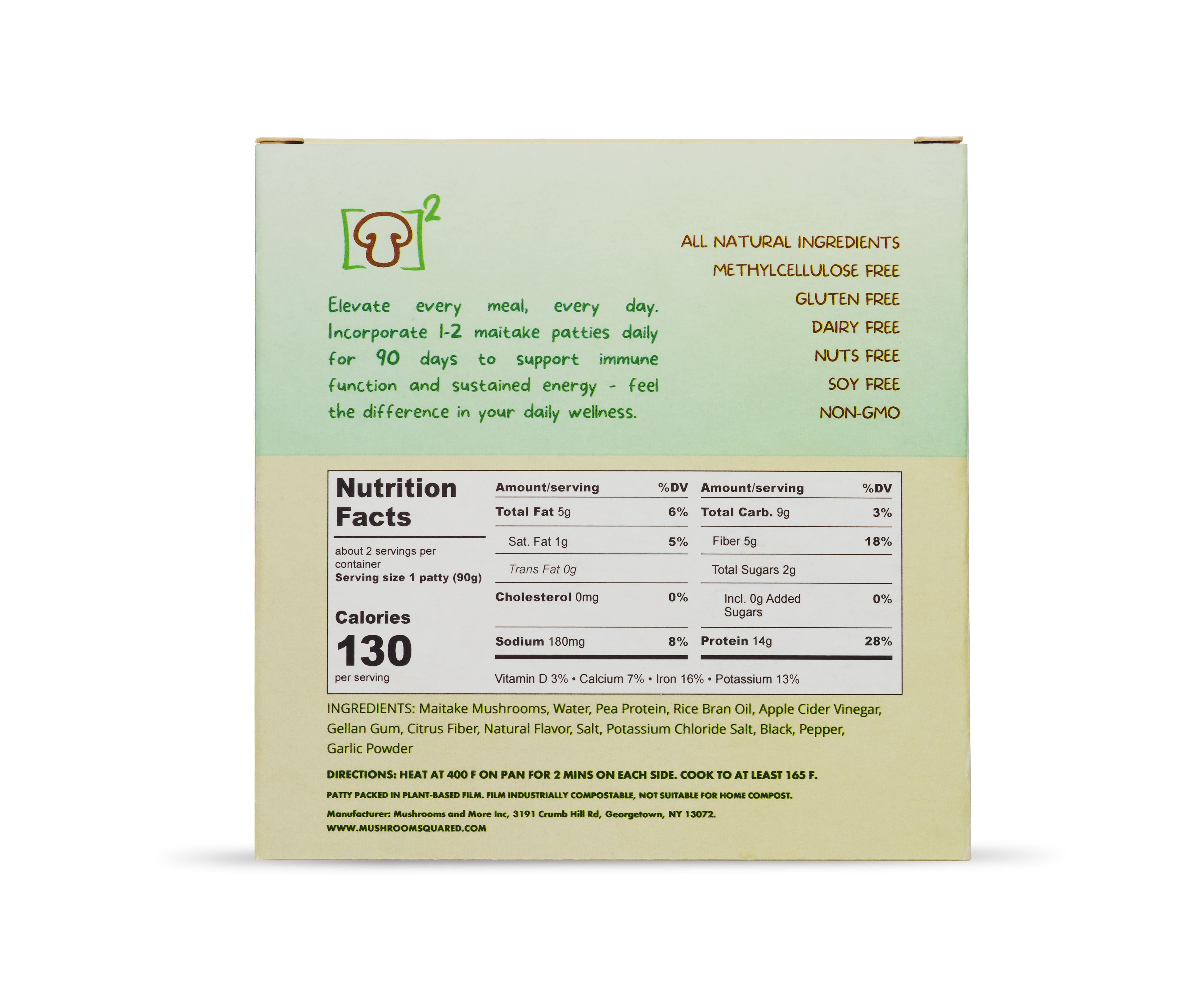 Mushroom Squared is on a mission to revolutionize plant-based eating with our square-shaped, frozen vegan patties crafted from nutrient-dense super mushrooms - Maitake. It is blended with wholesome plant-based ingredients. Each patty delivers 15g of protein, 4g of fiber, just 130 calories, and a burst of umami flavor that’s immune-boosting and irresistibly delicious. The patties come in three variants: 1) Full Flavor; 2) 2000 mg Lion’s Mane mushrooms; 3) Low fat, all while keeping things sustainable.